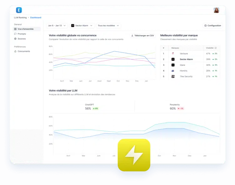 Evaluez votre visibilité sur ChatGPT et Perplexity liés à vos mots-clés business et situez vous par rapport à vos concurrents.